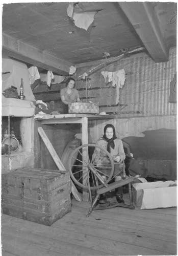 Äitini oli kotoisin Vienan Karjalasta, olen käynyt siellä jo 116 kertaa, minulla on sinne hyvät yhteydet. Kuvassa on äitini äiti Maria Hartikka, os. Rettijeva, kehräämässä. Ylhäällä uuninpankolla on äitini Aino Jaaksi, hoivaamassa pientä Sanelmaa.